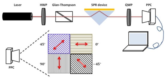 In order to measure the phase difference between the p-polarized and s-polarized components in the light beam after being affected by SPR, the phase-sensitive SPR based on simultaneous polarization measurement with common-path interferometry was established (Figure 1). A linearly polarized laser (Thorlabs Inc., Newton, NJ, USA) with a wavelength of 633 nm was used as the light source, with the output beam passing through a half-wave plate (HWP) and a Glan–Thompson polarizer to adjust the polarization for final contrast. After being incident into a homemade Kretschmann-based SPR device, the reflective light travels through a quarter-wave plate (QWP) to convert into a pair of orthogonal circular polarizations. Finally, the interference signals of the orthogonal circular polarizations were recorded by the PPC (LUCID Vision Labs, Richmond, BC, Canada). The PPC has a resolution of 2448 × 2048 and each pixel is aligned with a polarizer and a micro lens. The polarization directions of each adjacent 2 × 2 pixel are filtered at 0°, 45°, 90°, and 135°, respectively (Figure 1). Hence, light passing through the PPC can provide the intensity signal of each polarized pixel with its associated polarization information. Ultimately, the phase difference between the p-polarized and s-polarized components can be extracted from the four-polarization simultaneous measurement. The principle and algorithm of the phase extraction method used in this study are discussed in Section 3.1.