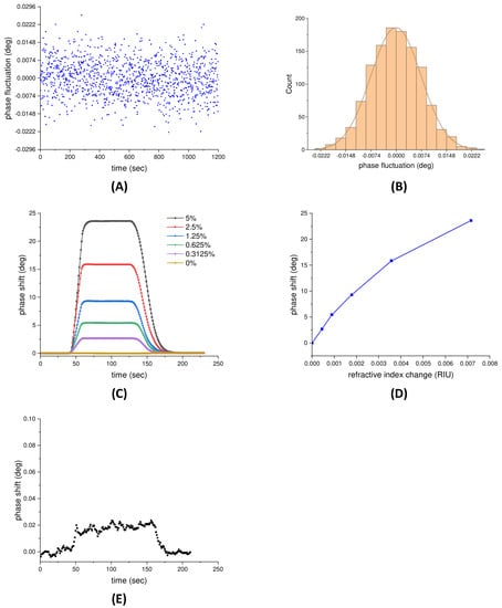 (A) The phase fluctuations of the system in DI water environment over a period of 20 min. (B) The distribution of the data points in phase fluctuation measurement. An angle of 0.0074 degrees indicates one standard deviation of the phase fluctuation. (C) The SPR phase shift measured by the phase-sensitive SPR sensor with respect to time for glycerol–water solution concentrations from 0% to 5%. (D) The relationship between the SPR phase shift and the refractive index change. (E) The phase shift of 0.3125% glycerol (8.94 × 10−7 RIU) measured by the proposed phase-sensitive SPR sensor.