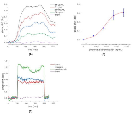 To detect glyphosate, the chip surface was modified with glyphosate receptors using the method described in Section 2.3. The sensorgrams of the glyphosate binding reaction ranging from 50 ng/mL to 50 μg/mL are shown in Figure 4A, which shows the SPR phase shift increasing in accordance with the increasing concentration of glyphosate. At the same time, PBS solution was the dilution buffer and also acted as the control group (blank). The sample was injected into the sensing cell and interacted with the immobilized glyphosate receptors around 100 s, and then the washing step began at approximately 700 s. The SPR phase shift with respect to the concentration of the glyphosate over the range of 50 ng/mL to 50 μg/mL is shown in Figure 4B. The standard curve of the glyphosate detection was analyzed by fitting with a nonlinear dose–response model, and the error bar indicates 1 SD in three independent measurements. In accordance with the definition of the International Union of Pure and Applied Chemistry (IUPAC), the detection limit of the proposed phase-sensitive SPR sensor for glyphosate detection was estimated to be 15 ng/mL from the experimental results. This value is almost one order of magnitude lower than the worldwide strictest residual level (0.1 μg/g or 0.1 ppm) of glyphosate. Moreover, we chose three herbicides (2,4-D, imazapyr, and pendimethalin) to further confirm the specificity of the receptor. Experimentally, the concentrations were 5, 4.6, and 5.6 μg/mL for 2,4-D, imazapyr, and pendimethalin, respectively. The results, shown in Figure 4C, revealed that after the washing step, no increment in SPR phase shifts was found in the three herbicides where the acquired phase shifts were similar to those of the blank test. This result implied that the receptor was specific to glyphosate herbicides.