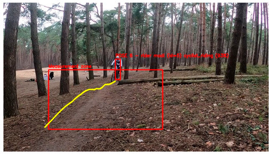 Illustration of the fence principle on a video frame of a cyclocross training session. The red rectangle is the region of interest. Results of pose detection, tracking, and post processing are illustrated by the yellow path within the fence.