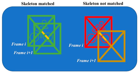 In the following two steps, a combination of computer vision and machine learning algorithms will gather more information about the riders that are present in the fence. As a start, an Alphapose pose estimator [18] is run on the frame to detect the riders and their body keypoints. To track riders through the frames, Alphapose offers various pose tracking implementations (e.g., PoseFlow, Human ReID, or detector based). However, after thorough experimentation with the different trackers and its parameter configurations, we were not able to achieve satisfiable results. The trackers work great on pedestrians, but on skeletons that are pedaling a bicycle, the tracking often fails. Our finding that traditional tracking algorithms make considerable mistakes in a sports context is also fortified in the literature [19,20]. The tracker can fail in two different ways: first, in a tracking identifier swap, especially after partial occlusion of one skeleton behind the other. Another tracking failure occurs when a new tracking identifier is assigned to an already seen skeleton. However, for further path analysis we decided to position the camera in such a way that it films the fence from not a frontal but an overhead camera angle. This has the advantage that the fence more accurately represents the real-life coordinates and that skeleton swaps are less likely to occur as there is a better unobstructed view of the riders (e.g., riders will not be hidden after each other). With this extra prerequisite in mind, we implemented a more straightforward yet purpose tailored spatiotemporally aware tracking mechanism that mostly circumvents the mentioned shortcomings of the trackers included within Alphapose. Full details of the tracking methodology can be found in Appendix A, but we will briefly discuss the main working principles of the technique. The technique keeps track of the skeletons seen in the last five frames with its last known coordinates within the fence. When a new frame is processed, the distance matrix between the old poses’ center locations and the new pose centers is calculated. The new pose matches with an older pose if it has the minimum distance to that old pose and the distance is smaller than 25% of its diagonal size of the bounding box around the new pose (see Figure 3 for an illustration of this approach). Each time a new frame is processed, the poses older than five frames ago are also removed from the pose match dictionary. This approach works very well in cycling as cyclists travel from a starting to an end point within the fence (i.e., they never go back in the fence), so the corresponding bounding boxes are also moving similarly through the fence over time.