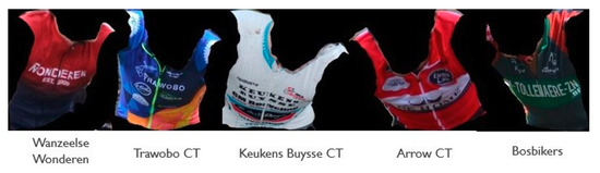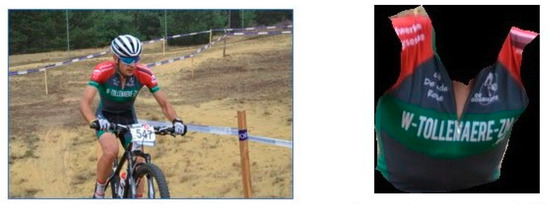 Another interesting metadata generator within the pipeline is the team (jersey) recognition module. The team jersey recognition should be capable of detecting which team a rider belongs to based on the team jerseys they are wearing. Team jerseys usually have distinct patterns with some sponsors on them. If team jerseys do not change over the years, it might be perfectly feasible to train a state-of-the-art object recognition model that has a couple of hundreds of images for each team. However, in practice, team jersey designs, sponsors, and even colors change usually every year (or sometimes even faster), which makes this approach rather unfeasible. To overcome this limitation, a methodology that only uses relatively few examples for each jersey class should be implemented. For this purpose, a transfer learning approach was used [21]. In neural network transfer learning, the trained knowledge of an existing neural network is reused to do the classification or detection task for another unseen but related problem [22]. This is usually done by removing the last output layer of the network and adding another one instead. All weights of the original network are frozen (i.e., are not trained any further), but the last layer’s weights are trained based on the (limited amount of) provided problem-specific training data. For our team classification module, we trained a RESNET18 model, with its last fully connected layer replaced by a linear layer that was retrained. In the first attempt of preparing the training data, the team jerseys were rectangularly cropped from a larger image. This introduced a lot of background noise in the image, which had a negative impact on the trained predictor’s accuracy. This shortcoming was mostly solved by an extra model that crops the relevant body parts from an image with background information [23]. For our model’s training data, we retrieved the torso from the humanparser’s generated body part segmentation output. The model is a Resnet-101 backbone adopting the Context Embedding with Edge Perceiving (CE2P) to segment the body in the different body parts. For our methodology, a network trained on the Pascal dataset to detect the following body parts: ‘Background’, ‘Head’, ‘Torso’, ‘Upper Arms’, ‘Lower Arms’, ‘Upper Legs’, and ‘Lower Legs’. For our predictor, we are only interested in the torso as these contain the logos and the distinct team patterns. The humanparser’s generated segmentation mask is used to crop out the jersey from the original image (see Figure 4). This significantly improved the model’s capability to accurately classify teams based on their jerseys. The F1 score on unseen validation data (different resolutions and view angles) increased from 68% to 78% with background subtraction and only the torso that was analyzed.