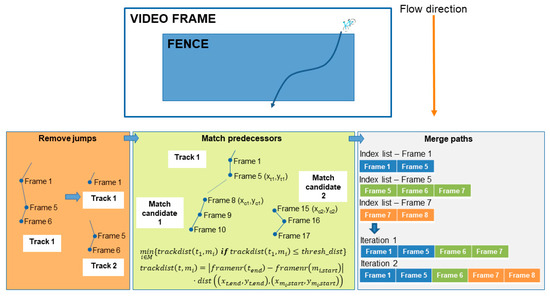 In summary, the merging process consists of three steps. In the first step, the paths are split based on jumps in frame numbers of the different tracks. A track is defined as a pose that was tracked over time in the fence and was assigned a tracking identifier. Tracks with non-subsequent frame sequences are split into separate tracks. This prepares the tracks for step two of the merging process, where the tracks are attempted to be merged again based on a spatiotemporal weighting function. As illustrated in Figure 5, a track has several candidates that can be matched. The selected candidate is the one with the minimum spatiotemporal distance and below a certain threshold that is set based on the fence’s dimensions. In the last step, the spatiotemporally linked tracks are iteratively matched based on the index lists of frame numbers within a track. This process stops if all paths have index lists that are non-overlapping.