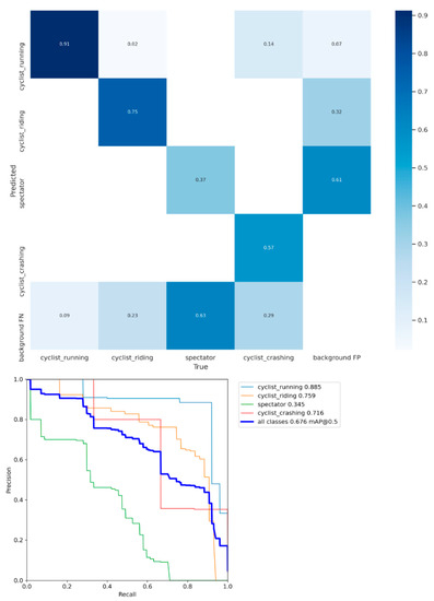 An important metadata generator within our pipeline is the ride mode detector. To train such a model, a training dataset of 869 images was constructed, with 747 cyclists that are riding, 457 running, 116 crashing, and 1038 spectators. The dataset was split uniformly across the categories in 75% for the training data, 20% for test, and 5% for validation. The data was used to train a YoloV5 model (yolov5s variant) for 100 epochs and achieved a mean average precision (mAP) of 68%. As can be seen in Figure 6, it is the spectator class that is degrading the model’s overall performance quite a bit as it classifies most spectators as background. This is not really a problem for this proposed methodology as we are only interested in riders and the confusion matrix shows us that there is no confusion between riders (either running or riding) and spectators. The real power of this detector is when it is used on a video sequence. In combination with the tracking results of the rider skeletons, the riders’ rider modi can be tracked over time. Figure 7 shows an illustration of the ride mode model that was run on a sequence of a men’s pro cyclocross race. The ride mode detector ran on each frame of this sequence and the color-coded arrows show the history for that rider across the video sequence. The combination of the video framerate and the fence analysis results can give an indication of the total time required to finish the sand sequence and how they did it (i.e., riding and running ratio).