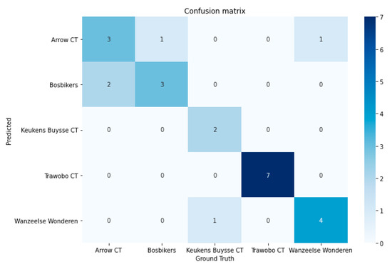 The next model that was trained to serve as the metadata generator in our ride line pipeline was the team detector model. To prove the effectiveness and its relative easiness to train with few sample images, a model was trained on five teams (see Figure 8 for an overview of the corresponding jerseys). For each team, a total of eight images were used to train the final output layer of the RESNET18 model. The training images were preprocessed using a set of (random) image transformations randomly performing light condition changes, horizontal flips, slight rotations, and/or cropping. The other three images were used for testing purposes. The model achieved a 96% validation accuracy after 10 epochs of training time. The model was further validated on a number of unseen images for each team. The confusion matrix of this extra validation data is shown in Figure 9. As could be seen, some teams are still mistaken for another, but the provided shots are from multiple camera angles and zoom levels, so additional more clever cropping might still improve the model’s prediction. This experiment with the five sample teams shows the effectiveness of this approach for the specific cycling use case. As team jerseys change at least once a season, the solution needs to be easily trainable and retrainable. The experiments show that good results can be achieved with relatively few training samples. In the future work section, we will discuss other possible improvements to make the model more performant and adoptable.