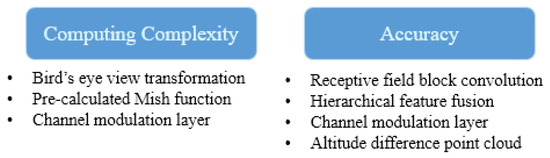 - The data are RGB colors obtained from the transformed image and the z-axis measurements, point stack, and intensity [22]. The altitude difference [23] from the transformed point cloud is used as the network input by fusing camera and LiDAR data in the bird’s eye view plane.