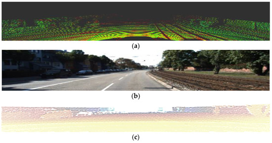 Examples of visual data. (a) The 3D point cloud raw data with 64-channel light detection and LiDAR data, (b) the 2D image with 1242 × 375 pixels, and (c) LiDAR data projected onto the image plane.