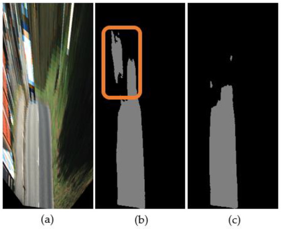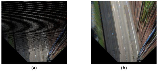 Bird’s eye view transformation is a method that changes an image’s orientation to where it is parallel to the ground. Because the data need to be rotated and translated, the image coordinates are transformed into normalized coordinates. Equation (4) shows the transformation matrix that changes in the image coordinates to in the normalized coordinates, where K is the camera-intrinsic matrix from Equation (3).