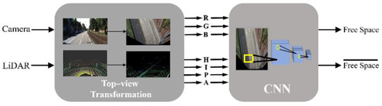 Due to rapid developments in deep learning technology, efficient and novel feature extractors based on networks that solve semantic segmentation problems have been examined, and these can be applied to road segmentation [1,2]. Studies conducted by Chen et al. [2] and Yu and Koltun [3] overcame limited computer resources, extracted features at various scales, and made accurate semantic detections using large receptive fields. Along with accurate modules, various methods increased computation speeds by modifying the modules’ breadth or depth [1,4]. Moreover, several modules that enhance the expressiveness of their kernel’s robust features have been announced. These modules have revised convolutional and feature-extraction capabilities, both of which are used to create rich data [5,6,7]. Most methods that solve the free space detection problem use an image-based encoder–decoder structure [8,9]. Thanks to advances in semantic segmentation, numerous methods that distinguish obstacles from roads have been developed. However, single image data processing networks are strongly affected by illumination changes. They are not robust enough to filter out visual noise, such as blurry images and overexposure, producing incorrect results and lowering confidence in obtaining accurate detection results. Unlike cameras, which are passive sensors, LiDARs, which are active sensors, are more robust to changes in the surrounding environment and provide physical data, such as distance, height, and intensity, to complement visual data shortcomings. The stereo camera has physical data [10] that are similar to those that a LiDAR sensor has by computing a disparity map. Fan et al. [11] and Liu et al. [12] proposed stereo vision-based free space detection. Fan et al. [11] generated additional driving scene images and conducted semantic segmentation DCNN. Liu et al. [12] calculated a disparity map to obtain a vanishing line via a road surface model and detected road boundaries. However, the stereo vision method suffered from poor long-distance data that were more sensitive and unreliable than LiDAR.