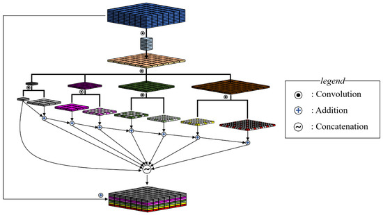 This study utilizes a method that combines hierarchical feature fusion (HFF) and concatenation to merge feature pyramids. HFF is a merging method that adds feature maps with larger receptive fields more frequently than maps with smaller receptive fields. This technique resolves the checkerboard problem and takes advantage of a large receptive field without losing the starting pixel’s characteristics due to a weighted value that decreases as the distance increases. The latent feature maps, whose depth is treated as /P, are sequenced for the output feature pyramid. Its sequential output is connected to the input feature map to take advantage of the skip layer’s strengths.