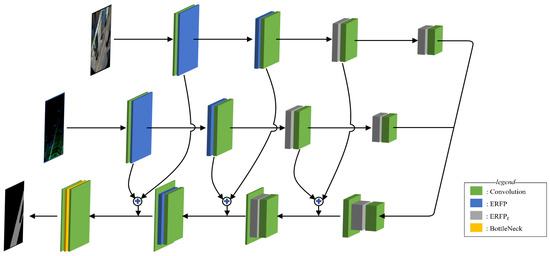 The additional tL data help the system divide curbstones or objects from the road to segment it using information such as the height or intensity. This section discusses a system that has been designed to detect free space. Section 4.1 describes an efficient receptive field pyramid (ERFP) module, which makes the model lightweight and accurate. Section 4.2 describes an encoder–decoder-based multipath network composed of ERFP modules. Section 4.3 depicts the data augmentation methods employed for their robustness when handling distortions.
