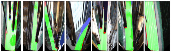 Examples of the road detection result projected onto a bird’s eye view image plane. The green pixels indicate true positives, red pixels indicate false negatives, and blue pixels indicate false positives.