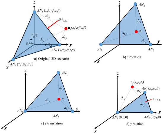 As illustrated in Figure 1, the location estimation of the node of interest, calculated by anchor nodes that define the reference plane (Figure 1a), is relative to the rotated/translated anchor’s coordinates (Figure 1d). Note that, after rotation/translation, the coordinates of node AN1 are (0, 0, 0); therefore, in order to obtain the scenario illustrated in Figure 1b,c, a rotation by angles α and β is performed in the z- and y-axis, respectively. Therefore, the coordinates (xj, yj, zj) of node nj with respect to plane P123 can be obtained from the following distance relationships: