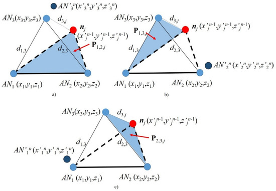 - The extra anchor node ANk (e.g., AN3 for reference plane P12j, see Figure 2a) performs self-localization (i.e., calculates the coordinates of AN’kn, namely, x’kn, y’kn, z’kn) based on the two noise-free distances with the other two original ANs (e.g., d13 and d23, if AN3 is self-locating) and one noisy distance (e.g., d’3,j, if AN3 is self-locating) with the estimated location of the new anchor node nj. For instance, if AN3 is self-locating, x3′n, y3′n and z3′n are calculated based on the distances d1,3, d2,3 and d’3,j and on the previous found coordinates (x’jn−1, y’jn−1, z’jn−1), using Equation set (2). Let us recall that n − 1 = 1 for the first recursion.