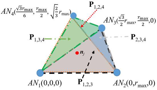 Note that, if more ANs are available, then we can obtain alternative planes that can be used for the location estimation of nj and this may improve the first nj location estimation (x’j1,y’j1,z’j1) used in the first step of the RL algorithm. The number of different planes that we can select to be used in the algorithm is given by the number of combinations NC3, where N is the number of available ANs. Thus, for N = 4, four different sets of three ANs are obtained; therefore, four different calculations of coordinates (xj, yj, zj) are possible (see Figure 3). In a noise-free environment, these four sets of equations lead to the same location estimation result. However, in practice, the estimated distances d’k,j are obtained from field strength or delay measurements and are impaired by different propagation phenomena or routing strategies. All these impairments render in different coordinate calculations that can be averaged to smooth out the difference. In [15], the authors proposed a PL method for a different 2D scenario based on a set of equations similar to those in (1); however, they did not take advantage of anchor point redundancy as we do in this paper. They related the equations in (1) by subtracting them and arranging terms in a matrix form, solving for a 2D scenario.