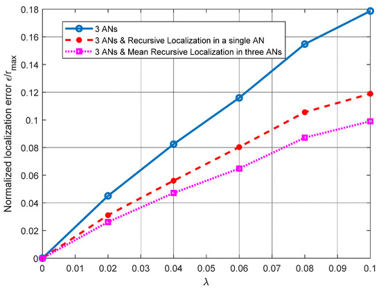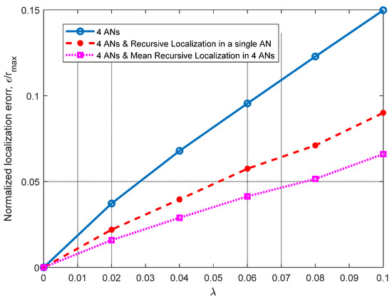 Let us recall that we expect to have a distance estimation noise derived from signal propagation impairments. In the following, we present the results of the mean squared Euclidean distance error ε between the estimated and true locations, normalized to rmax, i.e., ε/rmax. The normalization allows us to observe the error as a proportion of the reachability radius and to see if, for a larger value of rmax, this proportion does not change. This normalized location error is shown for an additive observation error Ek,j of the true separation between ANk and the node to be located, nj. Let us recall that Ek,j is exponentially distributed with parameter λ and proportional to the true distance dk,j from ANk to node nj, Ek,j~exp(λ) ∗ dk,j. This is the observed distance d’k,j from ANk to nj and can be expressed as d’k,j = dk,j + Ek,j. The simulations were conducted for a random location of node nj and the maximum coverage radius was initially set to rmax = 10 m.