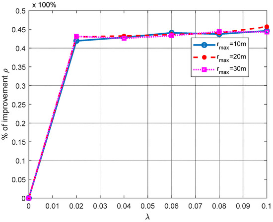 In Figure 8, we analyze the RL performance based on the improvement percentage ρ using the mean RL in three ANs, for the scenario illustrated in Figure 1b, where three ANs are located at the corners of an equilateral triangle, AN1 (0,0,0), AN2 (x2 = rmax,0,0) and AN3 (x3 = , rmax/2,0), and rmax is increased gradually. In this figure, we can observe a very desirable behavior, as the RL performance is not degraded as the operational space is increased.