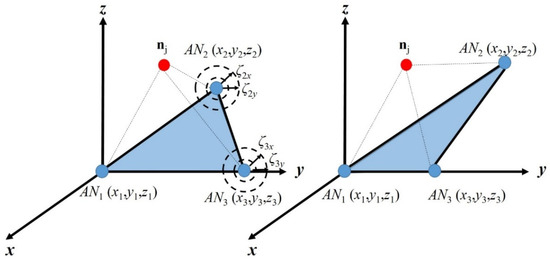 Let us recall that the reference planes illustrated in Figure 2 are obtained by rotation and translation of the original plane by applying Equation set (3). Finally, when the location estimation of anchor AN’kn (x’kn, y’kn, z’kn) is obtained, it can be transformed by translation/rotation to the original reference plane in order to calculate the corresponding recursive CV.