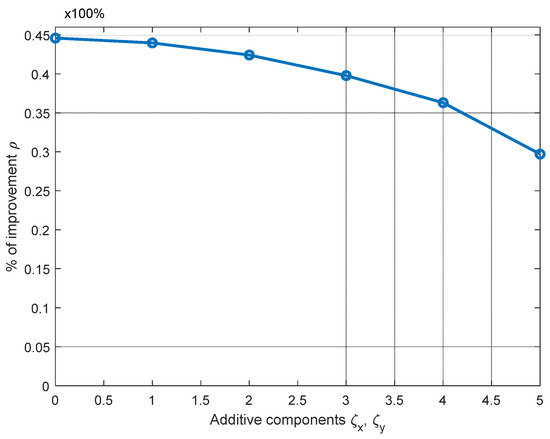 The deployment of AN2 is modified by adding to x2 and y2 random variables ±ζ2x and ±ζ2y respectively, while z2 is kept without alteration. The same modification is conducted for the coordinates of AN3. Let us recall that plane normalization by translation/rotation was carried out as explained before; therefore, we can consider that all the ANs are in z = 0. So, let us define the distances ζix and ζiy (i = 1, 2, 3) as two uniformly distributed variables, defined in the ranges [0 ζx] and [0 ζy], respectively. (See axis-x in Figure 10.) This is performed in order to generalize the results given by the RL algorithm. In Figure 10, we can observe that, for increments below the 30% of rmax (ζx = 1, ζy = 1), the accuracy improvement ρ is not severely degraded, as ρ only decreases by approximately 11%.