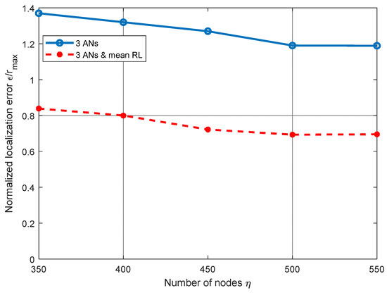 For multihop scenarios, a direct link from the ANs to the node to locate may not be available. In Figure 11, we analyze the performance of the localization technique using three ANs as in Figure 1, over multihop scenarios in a defined cube with side l = rmax. The shortest route from ANi to a node nj, is referred to as Ri,j and is obtained by Dijkstra’s algorithm, considering a homogenous reachability radius rmax = 3 m for all nodes in the network. For this analysis, the distance dij from ADi to node nj, is approximated by the hop count in the route linking the ANs to nj. In Figure 11, we analyze the RL algorithm performance over a multihop route scenario for a different number of nodes η in the operational space. In this analysis, we can see that, as the number of nodes in the network grows, the distance error given by the single plane (three ANs) equations using the mean RL in three ANs tends to decrease. This can be explained by the fact that, when the number of nodes increases, the network connectivity improves and better routes may be obtained. Let us recall that, in this evaluation, distance estimation is based on the hop count method. Note that the improvement achieved by the RL algorithm is always above approximately 30%.