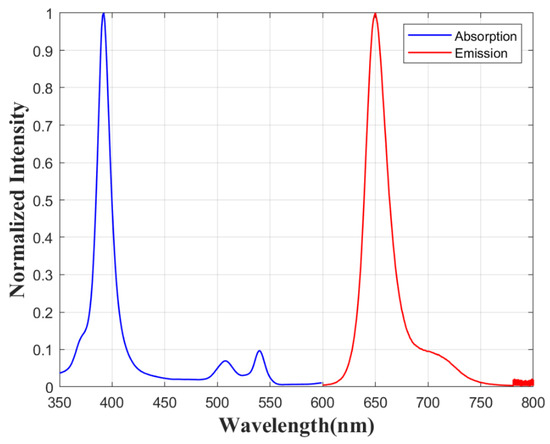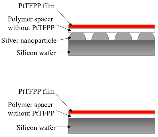 To assess the signal enhancement by silver nanoparticles (AgNPs) in vicinity to luminophore, pressure-sensitive films with AgNPs and reference samples without AgNPs were prepared. Structural scheme of the film is shown in Figure 1. A transparent spacer is required between AgNPs and the luminophore to keep the distance and prevent luminescence quenching. Platinum(II)-5,10,15,20-tetrakis-(2,3,4,5,6-pentafluorphenyl)-porphyrin (PtTFPP) is selected as luminescent molecule of pressure-sensitive film. PtTFPP is a common luminophore used in PSP due to its high pressure sensitivity and good photostability [1,2,20]. The absorption and emission spectra of PtTFPP are plotted in Figure 2 [21].