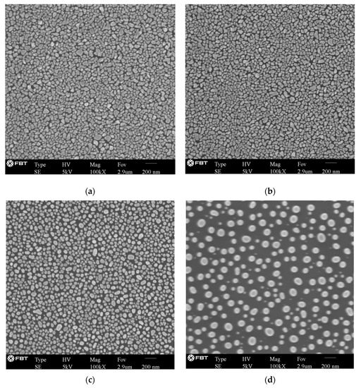 Morphologies of silver nanoparticles formed after difference thermal treatment process: (a) with no thermal treatment; (b) annealed at 80 °C; (c) annealed at 150 °C; and (d) annealed at 300 °C.
