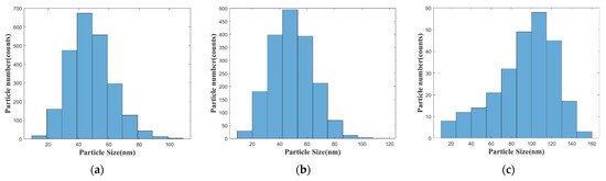 Histogram of AgNPs particle sizes after different thermal treatment process: (a) annealed at 80 °C; (b) annealed at 150 °C; and (c) annealed at 300 °C.