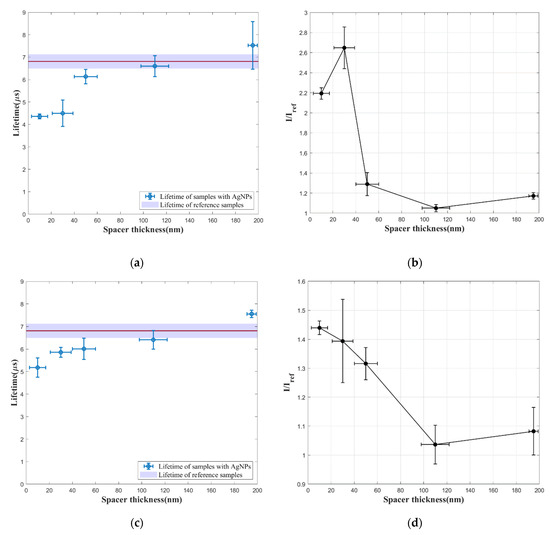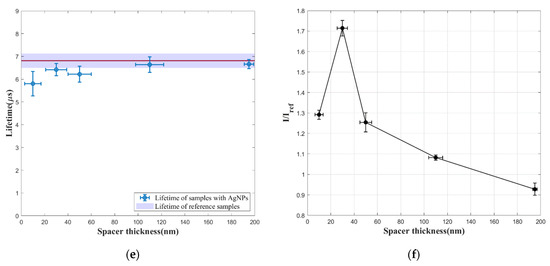 According to the lifetime results in Figure 5a,c,e, films with AgNPs with 10 nm spacer for all particle sizes show an obvious decrease in luminescence lifetime compared to the reference sample (without AgNPs). The decrease in lifetime is less obvious when the spacer layer becomes thicker, until no significant difference is shown by samples with spacer of 195 nm thickness. It can also be observed that the smallest silver particles lead to the most decrease in lifetime with the small spacer thickness (<40 nm). The lifetime decrease indicates the occurrence of LSPR due to the silver particles. Gartia et al. provided fluorescence-lifetime imaging microscopy (FLIM) results of different dyes on nanoplasmonic substrate surface [22]. They pointed out that the additional pathway of de-excitation due to the proximity of the metal particle can explain the shortened lifetime. Although the presence of the silver particles enhances the electro-magnetic field, radiative and non-radiative decay rate of luminophore increases, leading to decreased lifetime.
