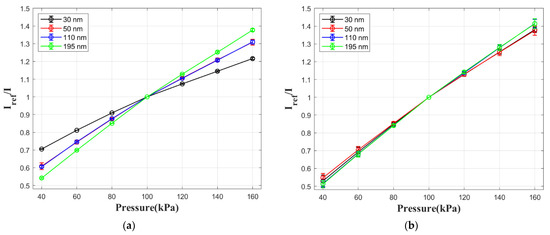Pressure calibration results of pressure-sensitive films with different spacer thickness: (a) films with AgNPs; (b) reference films with no AgNPs.