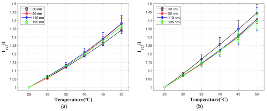 Temperature calibration results of pressure-sensitive films with different spacer thickness: (a) films with AgNPs; (b) reference films with no AgNPs.