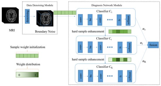 As shown in Figure 1, our diagnosis model consists of two major parts, namely, the data denoising module and the diagnosis network module. In Figure 1, the green part represents the weights of the samples, and the color depth represents the weight size. After 3D MRI samples are cropped by the data denoising module, they are input into the diagnosis network containing multiple classifiers. In the training process, the weight of each sample is continually adjusted according to the diagnosis error of the corresponding classifier, and each sample is input to the next classifier together with its updated weight so that hard samples can be assigned high weights in the next learning. Meanwhile, the fusion weight of each classifier is adaptively learned so that the diagnosis results of all classifiers can be adaptively fused in the testing process.