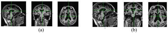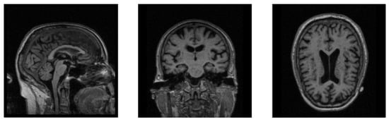 The MRI images are mostly 3D data, which contain more information than 2D data while requiring a larger amount of calculation during training, which makes neural networks less efficient when training 3D MRI data. In Figure 2, we show the sectional views of a 3D MRI image along three directions (sagittal plane, coronal plane, and axial plane). We can clearly see that there are many black noise regions near the margins of each image. These regions contain a lot of useless boundary voxels, which have no impact on brain tissues and need to be processed prior to training the neural network. The introduction of a large amount of noise not only slows down the process of model training, but also reduces the accuracy of diagnosis. The motivation of the data denoising module is to provide more valuable data for AD diagnosis as the inputs of our neural network, so as to improve the diagnostic accuracy of our network model. Based on this, a data denoising method is proposed, which removes the marginal noise regions in raw data to accelerate network training and improve diagnostic accuracy.