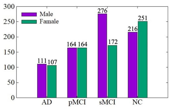 The ADNI data distribution is shown in Figure 4. There are a total of 1461 MRI images, including 767 males and 694 females, aged between 54 and 96 years. We conduct training and testing on the ADNI dataset to verify the effectiveness of the data denoising module and diagnosis network module proposed in this paper. The ratio of training set to the testing set is 7:3. In order to be consistent with the experimental results of existing work for comparison, we conduct AD vs. NC and sMCI vs. pMCI diagnostic experiments, in which the sMCI-image group and pMCI-image group adopt the same denoising method as AD-image group and NC-image group.