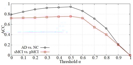 Analysis of the threshold in the data denoising module. As mentioned in Section 3.2, we first perform data denoising before inputting samples into the diagnosis network. The value will influence the denoising effect, thereby affecting the diagnostic accuracy. The curve of accuracy versus is shown in Figure 5 and the accuracy reaches a peak at = 0.5 in each diagnostic task (i.e., AD vs. NC and sMCI vs. pMCI). When is less than 0.5, the boundary noise of images is less cropped and the effect is not ideal. On the contrary, when is larger than 0.5, some useful information may be cropped. Thereby, we set = 0.5 in our experiments.