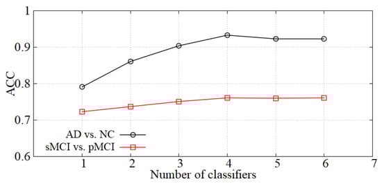 Magnetic resonance imaging (MRI) is a main medical neuroimaging method, which is an important basis for the diagnosis of Alzheimer’s disease. Compared with computed tomography (CT), the organization structure of MRI is clearer. Brain morphometric pattern analysis using MRI data are proven to be effective in identifying anatomical differences between populations of AD patients and normal controls (NC). In recent years, deep learning has achieved significant results in the field of computer vision, especially in the use of convolutional neural networks (CNNs) [1] to extract image features, which provides new ideas for AD diagnosis [2]. Many researchers have built 3D CNN models for AD diagnosis based on 3D MRI data, which contains more information compared with 2D data. However, 3D CNNs need a lot of training time. Some existing methods, for example, the voxel-based ones [3,4], patch-based ones [5,6] and ROI-based ones [7,8], tried to use part of an image for feature extraction [9,10,11], which require good priori knowledge to know which part affects the diagnosis of Alzheimer’s disease. Because the etiology and pathology of Alzheimer’s disease are not clear, these methods may reduce diagnosis accuracy. Some methods used whole images for feature extraction [12], which greatly increases calculation. Besides, most of the existing methods employed a single classifier for AD diagnosis, which limits the further improvement of diagnosis performance. Moreover, a limited number of MRI images were not fully used for AD diagnosis in currents models. Especially, there are few studies on hard sample processing to improve the diagnosis accuracy of Alzheimer’s disease. Therefore, although the existing methods have achieved good diagnostic results, there are still some problems that remain to be solved. The diagnosis of Alzheimer’s disease has the following challenges: