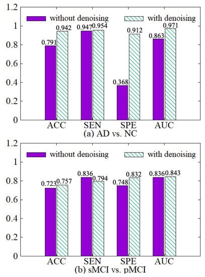 Effectiveness of the data denoising module. (a) shows the performance of AD vs. NC diagnostic task. (b) shows the performance of sMCI vs. pMCI diagnostic task.