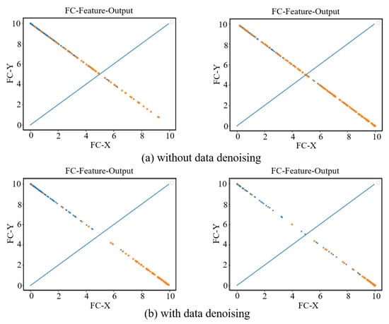 In order to see the effect of the data denoising module on the AD diagnosis, we visually show the features extracted from the last fully connected layer in the AD vs. NC and sMCI vs. pMCI diagnosis tasks. As show in Figure 8, the left sub-figure represents the AD vs. NC diagnosis task, and the right sub-figure represents the sMCI vs. pMCI diagnosis task. The features of a sample can be represented by a point (FC-X, FC-Y) in a two-dimensional space, where (FC-X, FC-Y) is the feature vector from the last fully connected layer of our network. The softmax function is used after the fully connected layer, so the points corresponding to all samples are on the straight line x + y = 1. In Figure 8, a blue dot indicates that the label is a positive sample, and an orange dot indicates that the label is a negative sample. In the final prediction, if y > x, the test sample is predicted as a positive sample, otherwise it is a negative sample. Therefore, the dividing line of the network model can be regarded as the straight line y = x. From this, it can be seen that the data denoising module improves the network’s ability to distinguish between positive samples and negative samples.
