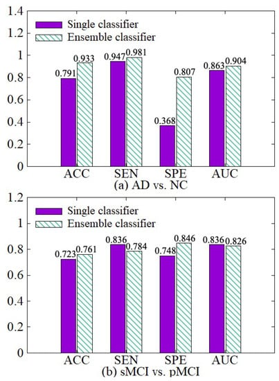 We make a comparative experiment which uses a single classifier and our diagnosis network, which incorporates the idea of ensemble learning and contains multiple classifiers. The experimental results are shown in Figure 9. After the diagnosis network module is used, the weights of hard samples are increased, so that the network strengthens the learning of the hard samples. Besides, the diagnosis network learns the fusion weights of various classifiers and the diagnosis results of multiple classifiers are adaptively fused together with their weights in the final fusion diagnosis. So the results of our diagnosis network on the four indicators ACC, SEN, SPE, and AUC are better than the single classifier in both AD vs. NC diagnosis tasks.