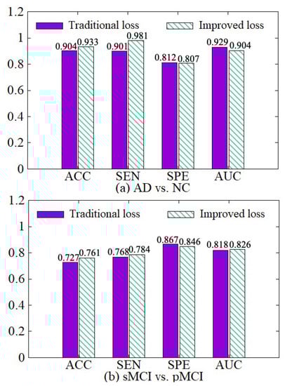Effectiveness of loss modification. (a) shows the performance of AD vs. NC diagnostic task. (b) shows the performance of sMCI vs. pMCI diagnostic task.