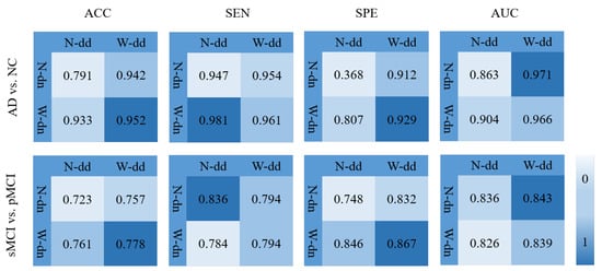 In order to verify the effectiveness of the model including the data denoising and the diagnosis network, we design an experiment as shown in Figure 11 where various background colors are used to indicate different diagnosis effects, and a darker color indicates a better effect. In Figure 11, W-dd means that the data denoising module is used, N-dd means that the data denoising module is not used. W-dn means that the diagnosis network module is used, and N-dn means that the network is trained with a single classifier. From the experimental results, it can be seen that W-dd and W-dn have achieved good results in both classification tasks. Among them, the two indicators of ACC and SPE have better results. The not very obvious effect of the AUC may be caused by the imbalance of positive and negative samples. In conclusion, the two modules proposed in this paper are effective for the diagnosis of this disease.