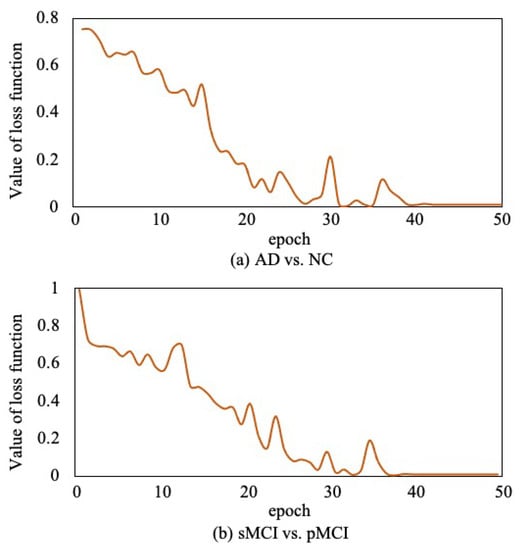 Moreover, to verify the convergence of the proposed method, as shown in Figure 12, we report the loss function value at each epoch in AD vs. NC diagnosis task and sMCI vs. pMCI diagnosis task. It can be observed that the objective function value decreases in the first 40 epochs and then gradually converges within 50 epochs.