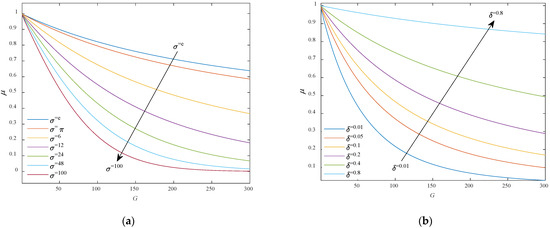 This paper tries to maximize the efficiency and optimization effect of the compression factor by determining the value range of δ and σ. Firstly, the total number of iterations N was assumed to be 300. Secondly, both δ and σ must be positive numbers, according to mathematical knowledge (otherwise, μ will be meaningless). Finally, the value of the compression factor should decrease with the increase of G, judging by its functional features. Therefore, the value range of δ and σ could only be one of the two cases: (1) and ; (2) and . The variation curves of μ in these two cases are discussed in detail below: