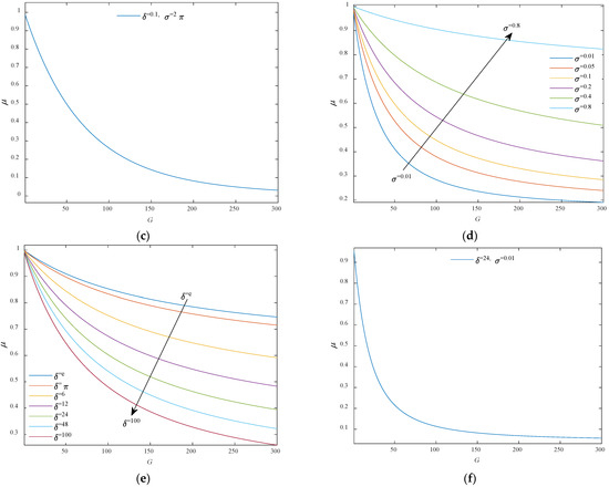 The characteristic curve of μ when the values of δ and σ change, including (a) δ = 0.5 and σ was increasing between (1,+∞), (b) σ = π and δ was increasing between (0.1), (c) one of the best constraint performance of μ was at δ = 0.1 and σ = 2π, (d) δ = 2π and σ was increasing between, (e) σ = 0.5 and μ was increasing between (1,+∞), (f) one of the best constraint performance of μ was at δ = 24 and σ = 0.01.