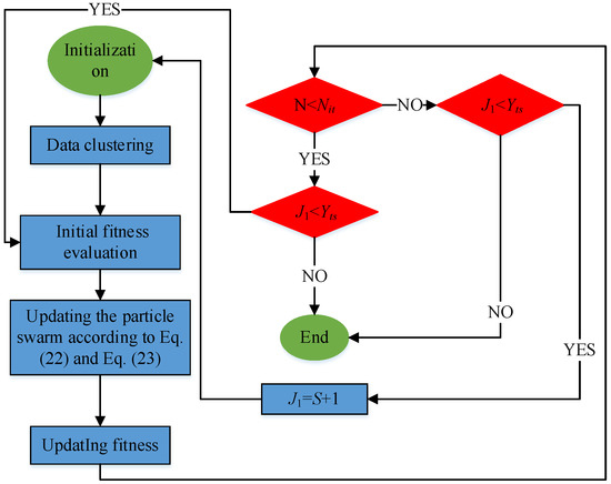 When the system model is unknown, y(k)∈R can be replaced by the actually observed output. The difficulty of J2 is that the division of input space cannot be separated from the parameter identification of the local model. The strong coupling between the two objective functions makes it necessary to determine the number of models and estimate the model parameters simultaneously. Therefore, this paper employs the ICF-PSO algorithm, which excels in parallel search and data clustering to optimize the number of models and parameters.