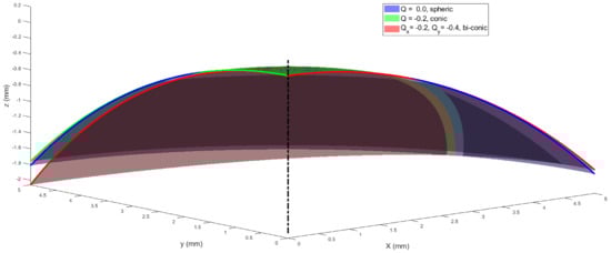 Simulated spheric, conic and biconic surfaces with a nominal radius of 7.8 mm in all cases, except in the biconic model, where Ry was set to 7 mm while Rx was kept to 7.8 mm. In this example, radius of aperture was set to 5.0 mm.