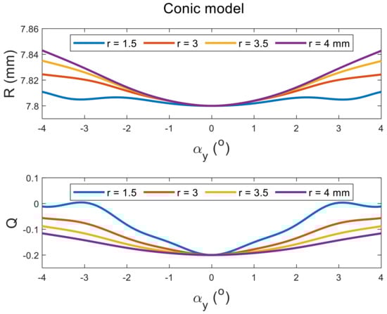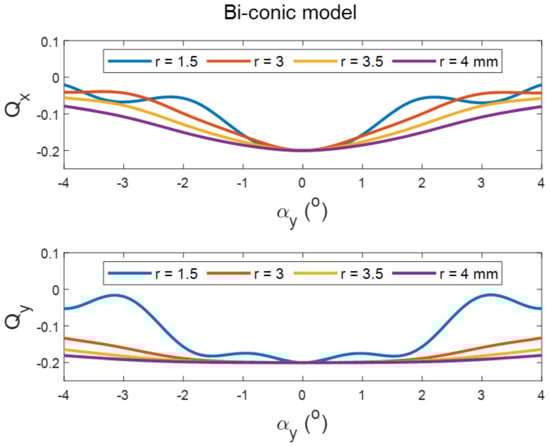 Tilting the perfect spherical surface did not cause any change in its apical radius, as expected. However, it did cause an increase in the apical radii of the surface with the increase in the tilt angle in both positive and negative directions, and aperture radii in conic and biconic models (Figure 2 and Figure 3, respectively). Different effects were noticed when the asphericity was investigated, as the value of Q tends to increase with the tilt angle but decreases with the increase in the aperture radii (see Figure 2 and Figure 4). It can be seen from the simulation results that the tilt effect of aperture radius r = 1.5 mm was quite different from other aperture radii, as there was a wavy shape in response to the tilt in both radii of the surface and asphericities.