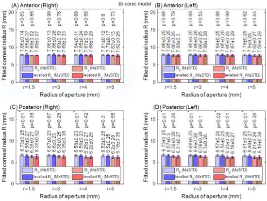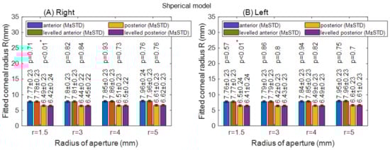 Fitting the corneal to spherical models did not show a significant difference between the raw-measured corneal surfaces and the levelled surfaces for right and left eyes, except at a radius of aperture 1.5 mm for the anterior corneal surface (p < 0.01), Figure 5. There was no asphericity to report with spherical models, as it must be set to zero by definition in all cases.