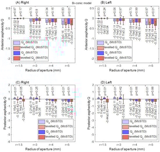 With the biconic model, no significant difference in corneal radii was found among raw-measured and levelled Rx and Ry data in both right and left eye anterior surfaces for all radii of apertures, as shown in Figure 7. When the anterior surface asphericity was investigated in both the nasal–temporal (Rx) direction and the superior–inferior (Ry) direction, the only significant difference was noticed at an aperture radius of 5 mm in the superior–inferior direction. This has been noticed in both right and left eyes, as seen in Figure 8A,B. Unlike the anterior surface, the posterior surface recorded significant differences at aperture radii of 1.5 mm, 3.0 mm, 4.0 mm and 5.0 mm (p = 0.01, p < 0.01, p < 0.01 & p < 0.01, respectively) in the nasal–temporal direction of right eyes and left eyes (p < 0.01, p < 0.01, p < 0.01 & p < 0.01, respectively), as shown in Figure 8C,D. In the superior–inferior direction, significant changes were noticed at aperture radii of 1.5 mm only for both right and left eyes (p = 0.05, p < 0.01).