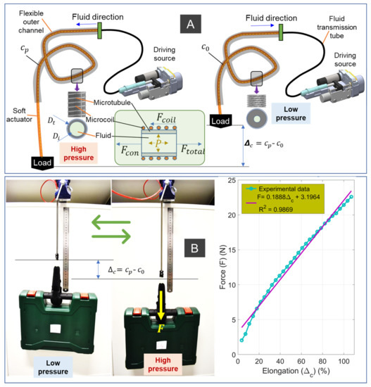Although the SA can transmit force and motion from a distance which is similar to that of conventional flexible cable mechanisms [56,57], it avoids high energy loss between the driving source and the soft actuator due to the use of hydraulic liquid as the transmission element. The SA generates motion via the local extension of individual actuation segment, where the outer helical coil restrains the radial expansion of the inner latex rubber tube, resulting in exclusively axial elongation of the SA under applied hydraulic pressure. The SA generates a contraction force , by reversing this motion if there is a reduction in hydraulic pressure. Specifically, it stores elastic energy (EE) by extending to a certain length under a high pressure, and it then releases this EE to pull load when this pressure is reduced (Figure 2). Depending on the specific application, the generated force highly relies on the choice of SA materials, its diameter, and the elongated length. Mathematically, the inner rubber tube will be lengthened from initial length to a length with a displacement , when a hydraulic pressure P is supplied to its channel. During the elongation, it accumulates EE, and when the pressure P is reduced, it discharges this EE to generate a contraction force . The higher the applied pressure P, the greater the elongation of , thus generating a higher contraction force against a load. It is noted that is the contraction force of the outer coil, where k is the coil stiffness coefficient. is the elastic force of the inner tube, and is the driving force generated by fluid pressure P, where E is the Young’s modulus of the inner silicone tube, is the cross-sectional area of the inner silicone tube once it is inserted into the helical coil, is the inner diameter of helical coil, is the inner diameter of the silicone tube.