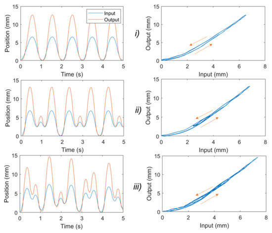 Experimental results for the soft actuator (SA2). Different input signals applied to the syringe plunger. They include 1 Hz sine wave input (i); two pairings of sine waves (combined frequency of 1 Hz and 1.5 Hz, (ii)); and two pairings of sine waves (combined frequencies of 1 Hz and 1.73 Hz, (iii)). (Left panel) Time history of the input and output displacement. (Right panel) input displacement of the syringe plunger versus the SA2 elongation.